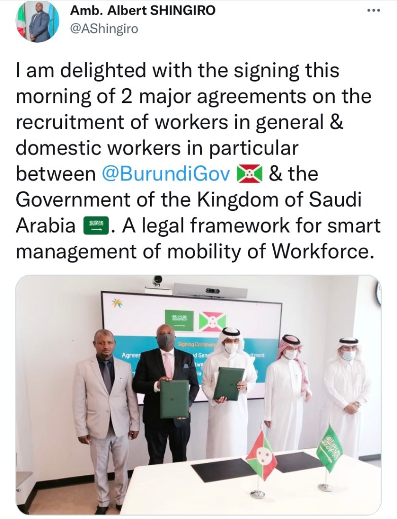 In 2015, Ethiopia, Kenya and Uganda banned domestic workers going to the Gulf and the Kenyan government revoked 930 licences of recruitment agencies. In 2017, the ban was lifted and recruitment commenced though corrupt systems that ensured a supply of people being trafficked to work in the Middle East. According to the Kenya’s Foreign Ministry, 89 Kenyans, most of them domestic workers have died in Saudi Arabia in the past two years. The Saudi government maintains that most deaths were due to cardiac arrest but officials in Kenya have deemed them suspicious. In September 2021, the Kenyan government put a temporary ban on the recruitment and exportation of Kenyan domestic workers to Saudi Arabia until adequate protective measures are put in place. Well, that was very short lived if agencies were already publicly recruiting for more workers over the radio just a month after the ban was enacted. Meanwhile in Burundi, their government just signed a major agreement in October with the government of Saudi Arabia to recruit workers and domestic workers.